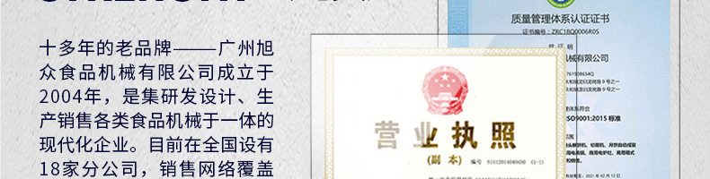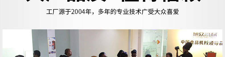廣州旭眾食品機械有限公司是一家集科研開發,生產設計,營銷服務為一體的現代化生產企業?,F代化生產車間,精湛制造技術,所產機械歷經市場重重考驗,不斷贏得海內外客戶的贊譽。