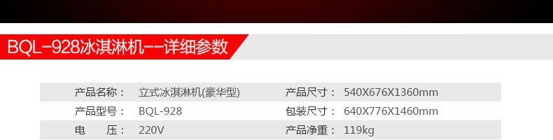 名稱BQL-928立式冰淇淋機(jī) 電源220V 功率2.3kw 產(chǎn)量22-30L/H 尺寸540*590*1360mm 重量119kg 規(guī)格 其他