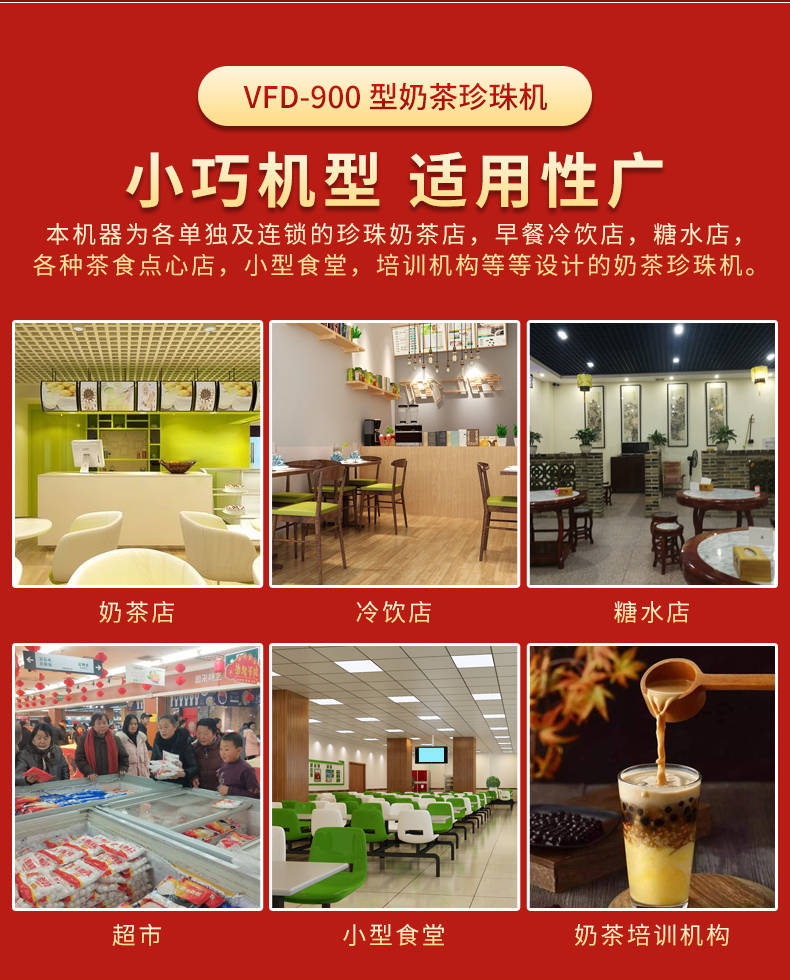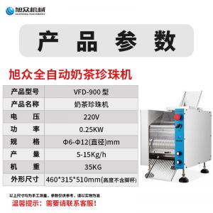 VFD-900珍珠奶茶機,奶茶店、甜品店可用。可生產奶茶珍珠,果蔬圓子,無餡湯圓,水晶湯圓,各種芋圓。不占空間、體積小、重量輕,桌面上的小奶茶珍珠機。告別手工繁瑣的工序,省時省力,輕松解決手工麻煩,成本高等一系列問題