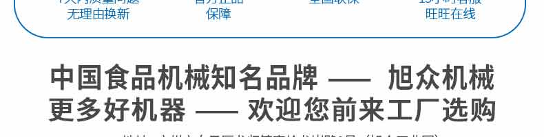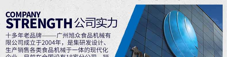 廣州旭眾食品機(jī)械有限公司是一家集科研開發(fā),生產(chǎn)設(shè)計,營銷服務(wù)為一體的現(xiàn)代化生產(chǎn)企業(yè)。現(xiàn)代化生產(chǎn)車間,精湛制造技術(shù),所產(chǎn)機(jī)械歷經(jīng)市場重重考驗(yàn),不斷贏得海內(nèi)外客戶的贊譽(yù)。