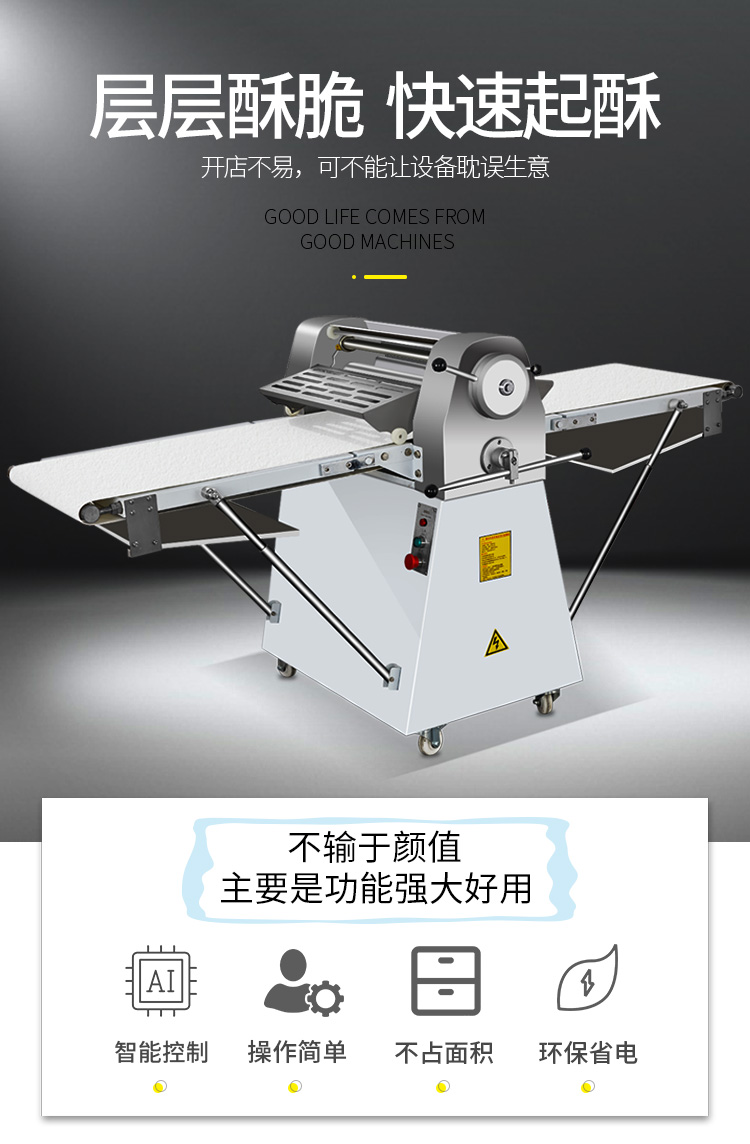 LSP-520酥皮機,采用獨特的鏈輪傳動替代了傳統易磨損的塑輪傳動,低噪音,高壽命滾輪經過特殊工藝處理,不粘面,不易刮傷適用于手撕面包、羊角面包、蛋撻、老婆餅、千層餅,等酥皮類食品,也可用于輾壓面團。