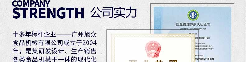 廣州旭眾食品機(jī)械有限公司是一家集科研開發(fā),生產(chǎn)設(shè)計(jì),營銷服務(wù)為一體的現(xiàn)代化生產(chǎn)企業(yè)。現(xiàn)代化生產(chǎn)車間,精湛制造技術(shù),所產(chǎn)機(jī)械歷經(jīng)市場(chǎng)重重考驗(yàn),不斷贏得海內(nèi)外客戶的贊譽(yù)。