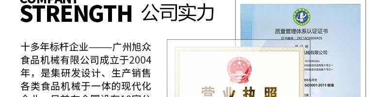 廣州旭眾食品機(jī)械有限公司是一家集科研開(kāi)發(fā),生產(chǎn)設(shè)計(jì),營(yíng)銷服務(wù)為一體的現(xiàn)代化生產(chǎn)企業(yè)。現(xiàn)代化生產(chǎn)車間,精湛制造技術(shù),所產(chǎn)機(jī)械歷經(jīng)市場(chǎng)重重考驗(yàn),不斷贏得海內(nèi)外客戶的贊譽(yù)。