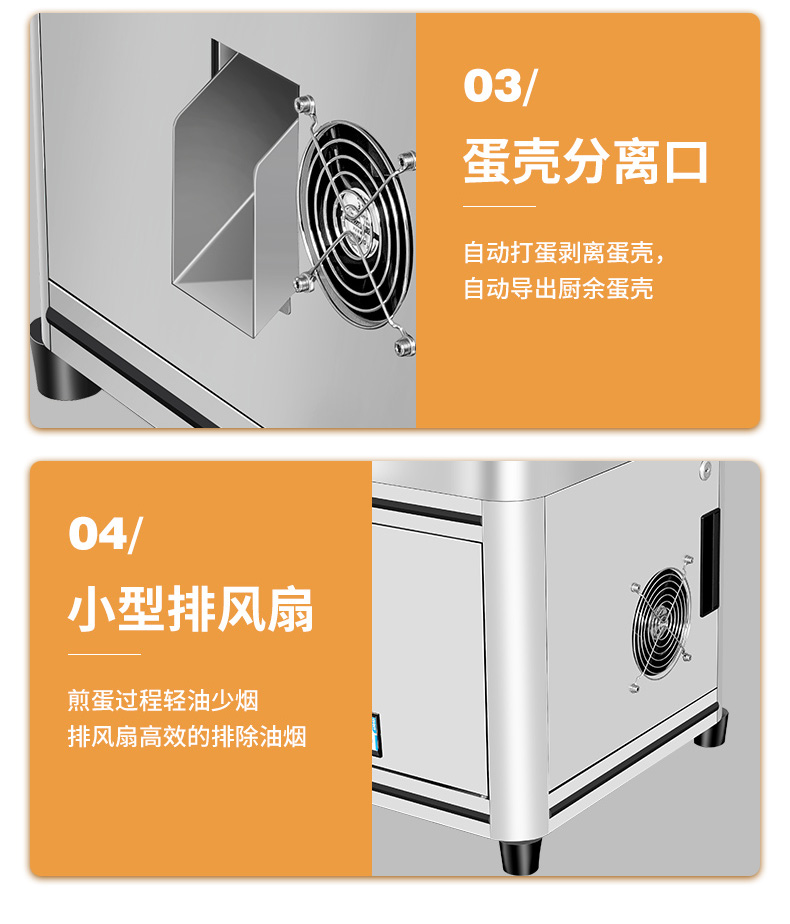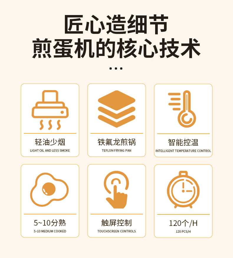 商用全自動智能煎蛋機,匠心造細節煎蛋機的核心技術,輕油少煙、5~10分熟、鐵氟龍煎鍋、觸屏控制、智能控溫。口味個性化五分/七分/十分熟,智能控溫上下鍋恒溫煎烤。