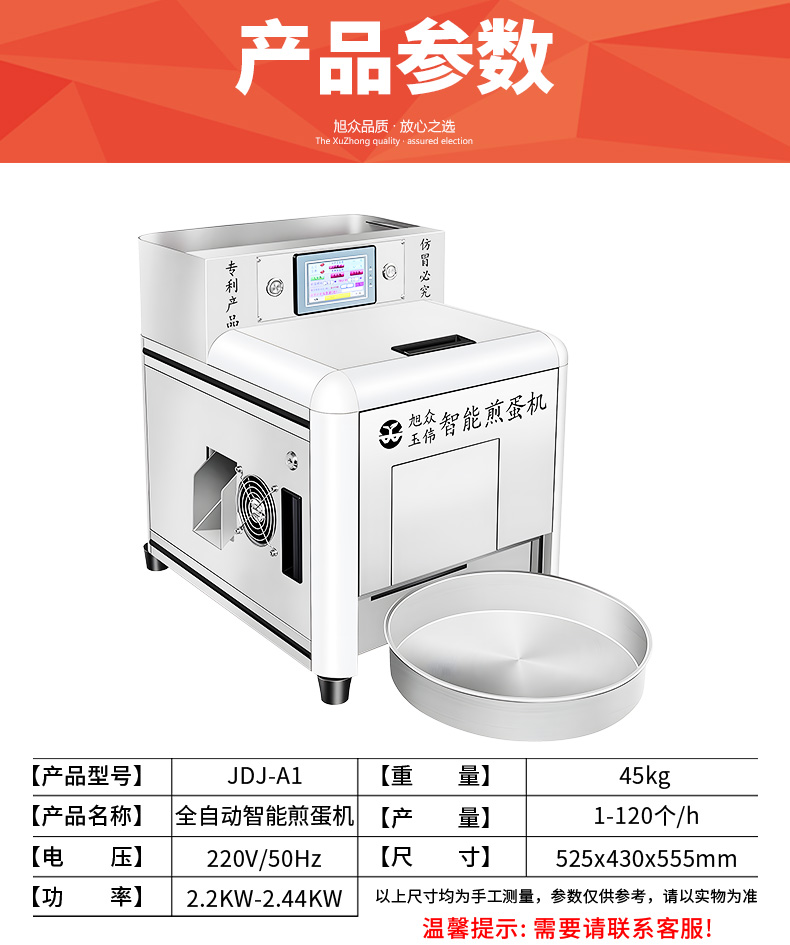 名稱商用全自動智能煎蛋機 電源220V/50Hz 功率2.2KW-2.44KW 產量1-120個/h 尺寸525x430x555mm 重量45kg 規格 其他