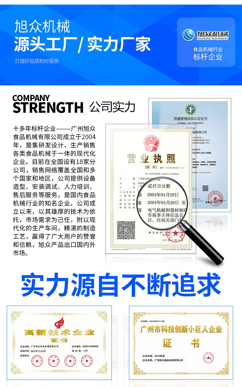 廣州旭眾食品機械有限公司是一家集科研開發,生產設計,營銷服務為一體的現代化生產企業。現代化生產車間,精湛制造技術,所產機械歷經市場重重考驗,不斷贏得海內外客戶的贊譽。