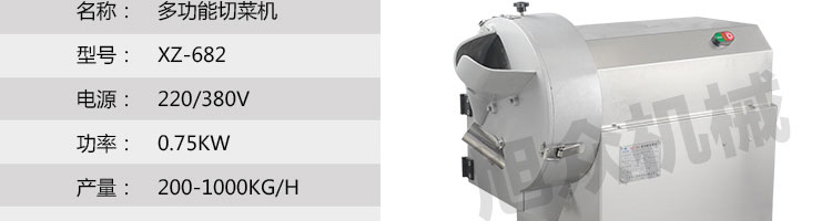 名稱XZ-682多功能切菜機 電源220/380V(見機器銘牌) 功率0.75kw 產(chǎn)量200-1000千克/小時 尺寸770*460*800mm 重量140kg 規(guī)格標(biāo)配刀具尺寸:切絲:3mm,切片:3mm,切丁:10*10mm。可選的刀具尺寸:切絲:4、5、6mm 其他