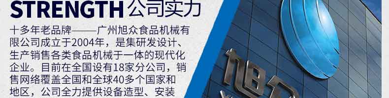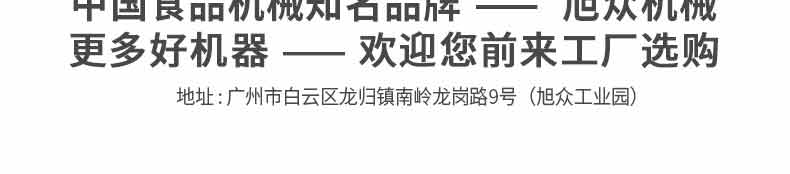 廣州旭眾食品機械有限公司是一家集科研開發(fā),生產設計,營銷服務為一體的現(xiàn)代化生產企業(yè)。現(xiàn)代化生產車間,精湛制造技術,所產機械歷經(jīng)市場重重考驗,不斷贏得海內外客戶的贊譽。