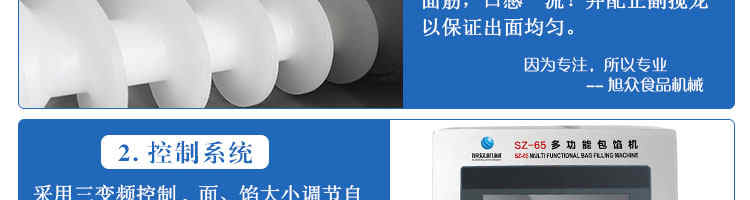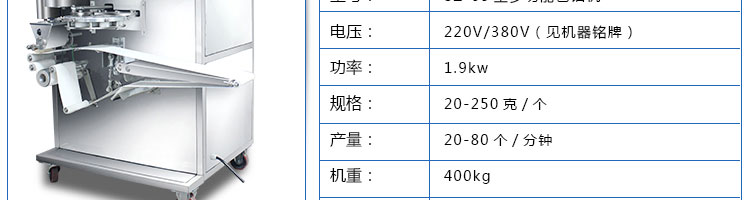 名稱SZ-65型多功能自動包餡機 電源220/380V 功率1.9kw 產量20-80個/分鐘 尺寸1130*920*1650mm 重量400kg 規格20-250克/個 其他皮餡比例2:8 5:5