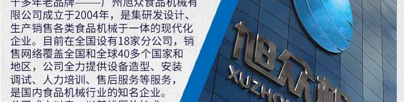 廣州旭眾食品機械有限公司是一家集科研開發,生產設計,營銷服務為一體的現代化生產企業?,F代化生產車間,精湛制造技術,所產機械歷經市場重重考驗,不斷贏得海內外客戶的贊譽。